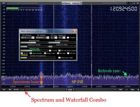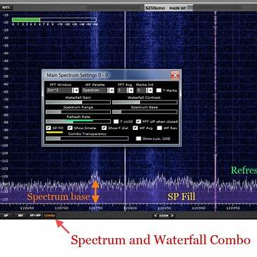 - In the Main SP window (spectrum + waterfall), click the “SETT” button (or “Main SP Settings”) near the top or side of that panel. That opens a settings dialog that includes Spectrum Range / Offset / dB scale / Reference level controls. (See upper-left of image panels)