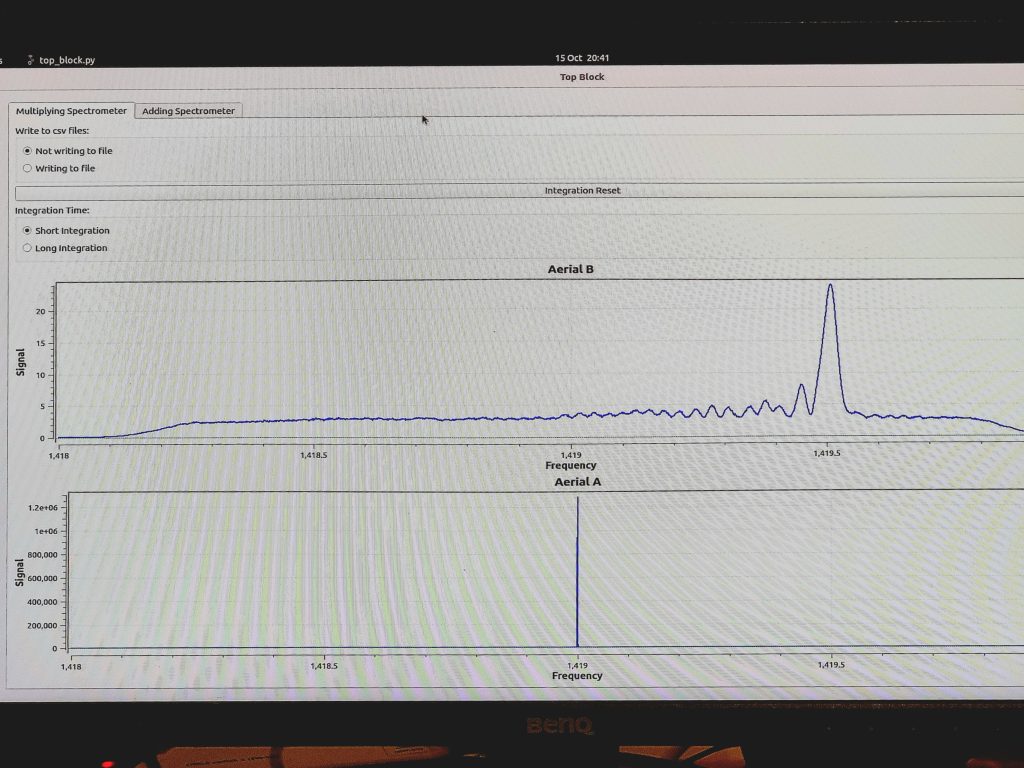 This will not be Milky Way as inside and Doppler shift on the 1420 MHz line too big – about 190 km/s (calculated from the difference in frequency on plot below and 1420 MHz) – so probably RFI (Radio Frequency Interference) but does it show interference pattern? i.e. is this working as interferometer, albeit not on Milky Way transmission – and hence could I reasonably expect it to work as interferometer once i set up outside pointed at sun or Milky Way?