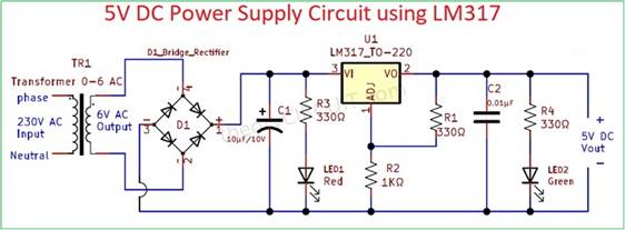 In this Amazon power supply the voltage regulator utilizes an adjustable LM317 regulator a variant adjustable regulator which is a bit different from the 7805 fixed output type in that although it is also a voltage regulator you can program it by a set of resistor dividers to set the final voltage you want it to regulate for it’s output.