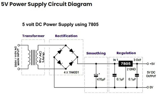 Two main types are used, the fixed voltage output regulators and the adjustable regulators that will control the rectified and filtered output DC voltages. They usually require an input voltage slightly higher than what is finally needed for the final regulated voltage output, say a 7-8 Volts input and then the regulator IC chip will then control it to the lower output voltage that it was designed to regulate. In the case of a popular chip component, a 7805 voltage regulator, those 7-8 volts into the 7805 will be regulated to always be an output of 5V as the final power supply output.