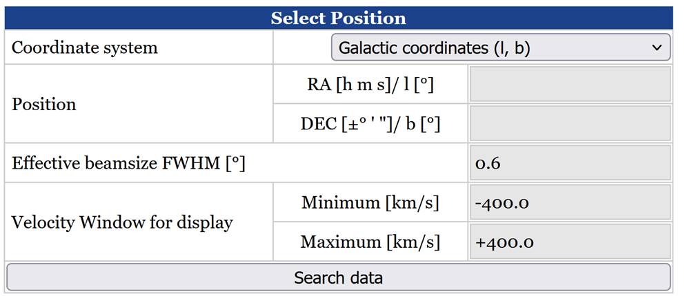 Observations were made with the Dutch 25m telescope in Dwingeloo and the Argentinean 30m telescope in Villa Elisa. The full width half maximum(FWHM) beam-size is 0.6° but you may choose a beam-width for a smaller telescope (e.g. 5° for a 3m telescope). Please use this option with care, large FWHM values demand excessive calculations. This may fail if the calculations take too much CPU time or if the Internet data transfer is too slow.