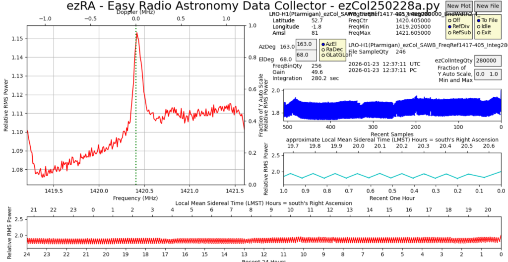 Post navigation Hydrogen Line peak (H-Line, 1420 MHz) screen capture from ezCol.py capture software (part of ezRA suite) collecting data from a RTL-SDR Blog v3 Software Defined Radio on LRO-H2 radio telescope (150cm dish) on 22/1/2026