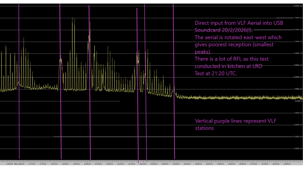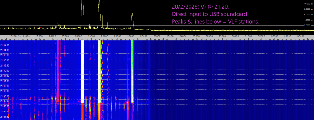 Bits and pieces arrived to make new aerial – and attached are test screenshots from Spectrum Lab – 6 stations seen clearly. This time, for some reason, the plug-in USB audio card is working – do not know what happened last time.