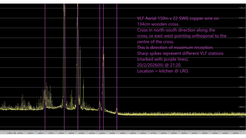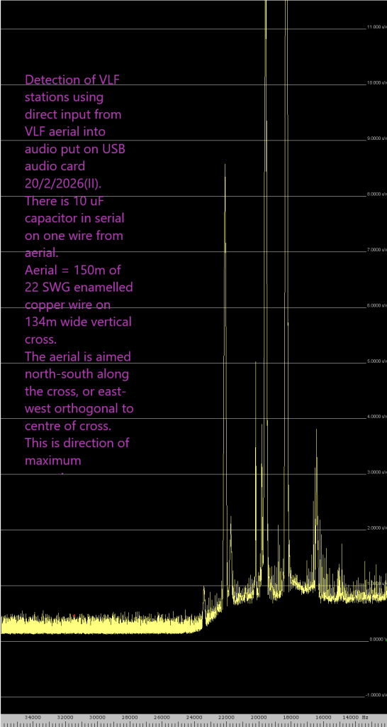 NB I have a 10 uF capacitor on 150m x 22 SWG enamelled copper wire wound around 134cm wide wooden cross. Maximum peaks when cross orientated north-south along cross (i.e. east-west orthogonal to centre of cross).