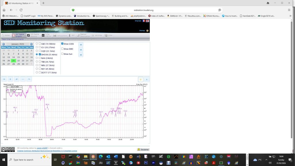 My goto website for comparison – as I think his traces are amazing is SID Monitoring Station (https://sidstation.loudet.org/data-en.xhtml) and here is his trace from 21/1/2026 at same frequency (23.4 kHz):